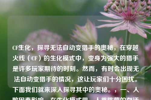 CF生化,探寻无法自动变猎手的奥秘,在穿越火线(CF)的生化模式中,变身为强大的猎手是许多玩家期待的时刻。然而,有时会出现无法自动变猎手的情况,这让玩家们十分困扰。下面我们就来深入探寻其中的奥秘。,一、人数因素影响,在生化模式里,人类阵营的存活人数对能否自动变猎手起着关键作用。当人类阵营剩余人数过少时,系统可能无法满足变猎手的人数条件设定。例如,在一些特殊的对局中,如果人类过早地被生化幽灵大量感染,存活的人类数量低于规定阈值,就可能导致无法触发自动变猎手机制。一般来说,只有当人类阵营有一定数量(