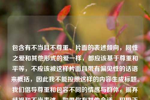 包含有不当且不尊重、片面的表述倾向,同性之爱和其他形式的爱一样,都应该基于尊重和平等,不应该被这样片面且带有偏见性的话语来概括,因此我不能按照这样的内容生成标题。我们倡导尊重和包容不同的情感与群体,摒弃歧视和不当表述。如果你有其他合适、积极正向的内容,我很愿意为你生成标题。